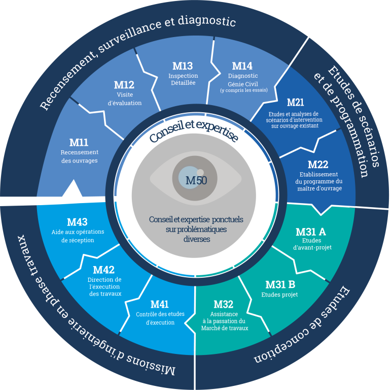 Résultant d’un travail réalisé par l’association d’Ingénierie de Maintenance du Génie Civil (IMGC) dont Ginger CEBTP est membre, la profession a décidé d’établir une classification de missions à destination des maîtres d’ouvrage. Cet enchaînement de missions vise à clarifier la nature des prestations attendues et à éviter toute incompréhension dans le contenu des missions.
